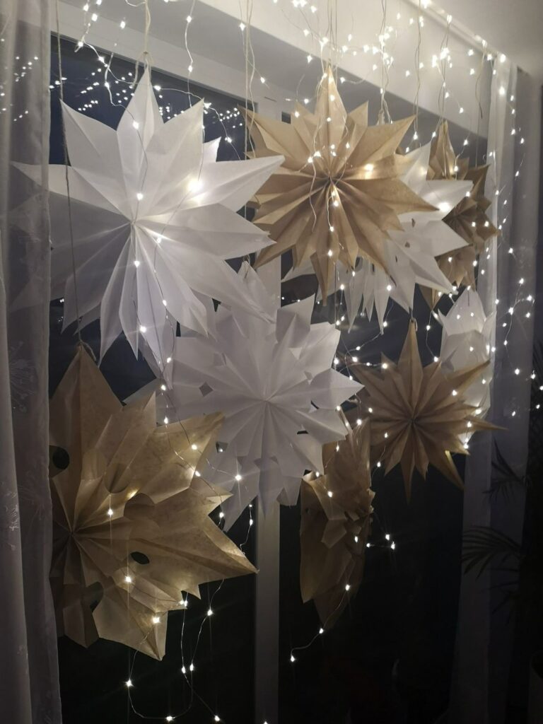 Az ablak felső részére vagy a karnisra is akaszthatunk karácsonyi gömböket vagy csengőket. Nagyon népszerűek a papírból készült karácsonyi díszek is. Különösen az otthon elkészíthető vagy készen is megvásárolható papírcsillagok, amelyek igazán eredeti megjelenést kölcsönöznek.