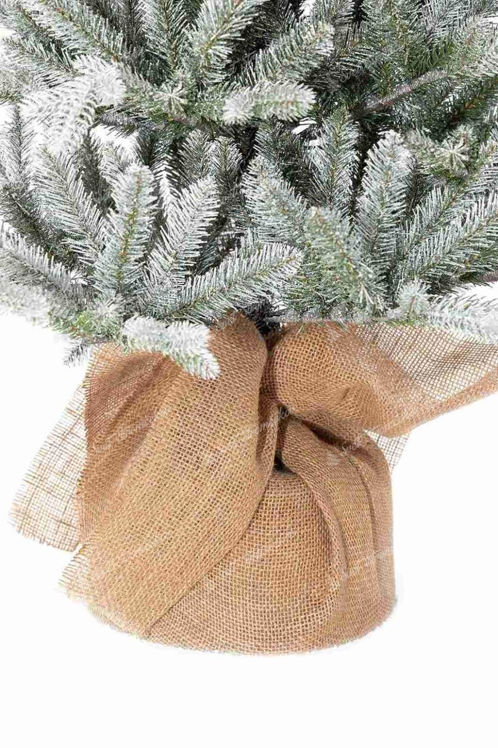 A műfenyő jutával borított cserépben kapott helyet, amely nemcsak esztétikus, hanem praktikus megoldás is. Tökéletes kiegészítője a karácsonyi hangulatnak.