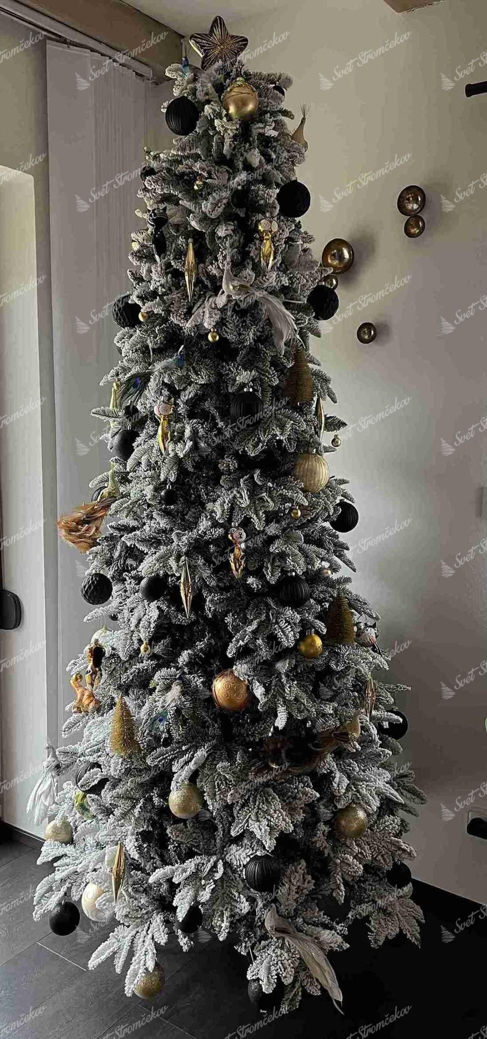 Modern műfenyő keskeny kialakítással. A 3D Havas Ibériai Jegenye műfenyő a 2024-es szezon újdonsága. A fa eredeti megjelenését a finoman és szabálytalanul hóval borított ágak adják, a természetben frissen behavazott fát utánozva. A fa belsejét hóval borított klasszikus PVC ágak egészítik ki, amelyek sűrű megjelenést kölcsönöznek neki.