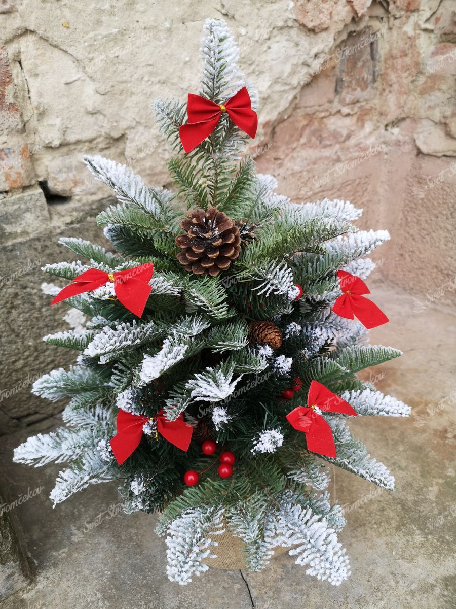 A 3D-s tűleveleket havas tobozok és erdei bogyók egészítik ki, így a fenyőfa csodaszép, tradicionális látványt nyújt. A 3D-s tűleveleken kívül a fa hagyományos, PVC tűkkel van kiegészítve, melyeknek a gallyai végét szintén hó borítja, így tökéletesen megelevenítve az élő, havas fa hatását. A fenyőfa egy elegáns zsákvászonba burkolt cserépbe van beállítva.