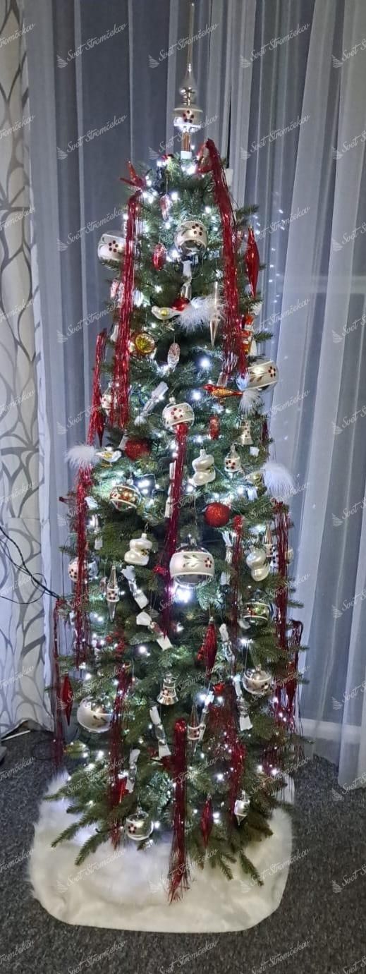 3D-s műkarácsonyfa, magasság 180cm, szélesség 85cm, természetes 3D-s lucfenyő tűlevelek, tűlevelek típusa 3D-s (PE) + PVC, kivitelezés – sűrű, fémtalp, csúcshosszúság – 20 cm, alkotórészek száma –2