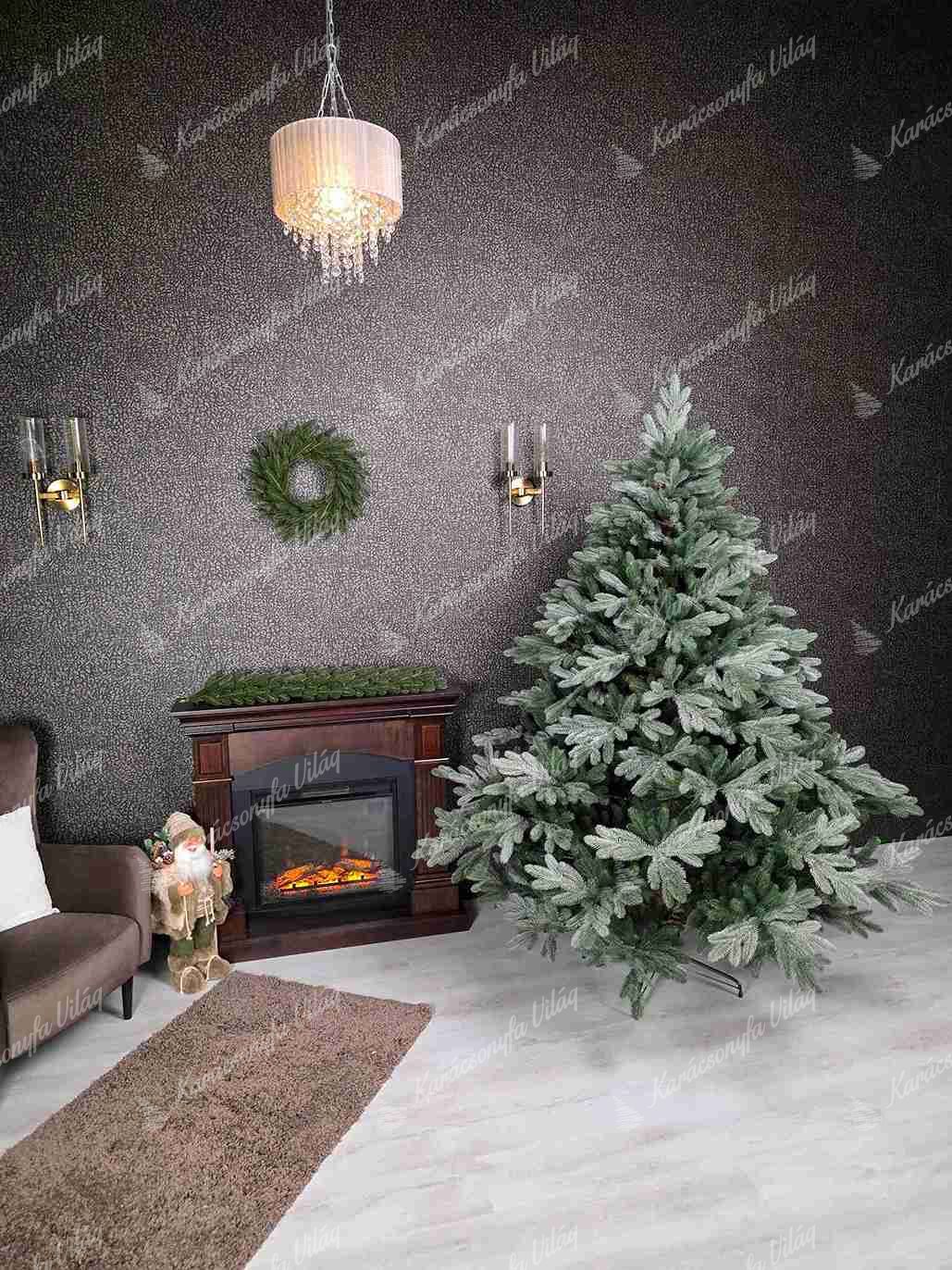 A tűlevelek egyedi kétszínű hatása – sötétzöld a műfenyő belsejében és ezüst a gallyak végén – bájos kontrasztot teremt, amely a finom hófödte gallyakra emlékeztet. Ez a részlet elegáns és friss téli megjelenést kölcsönöz a fának.