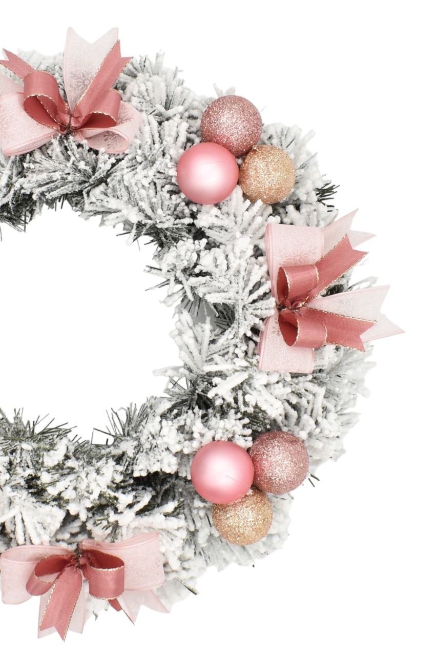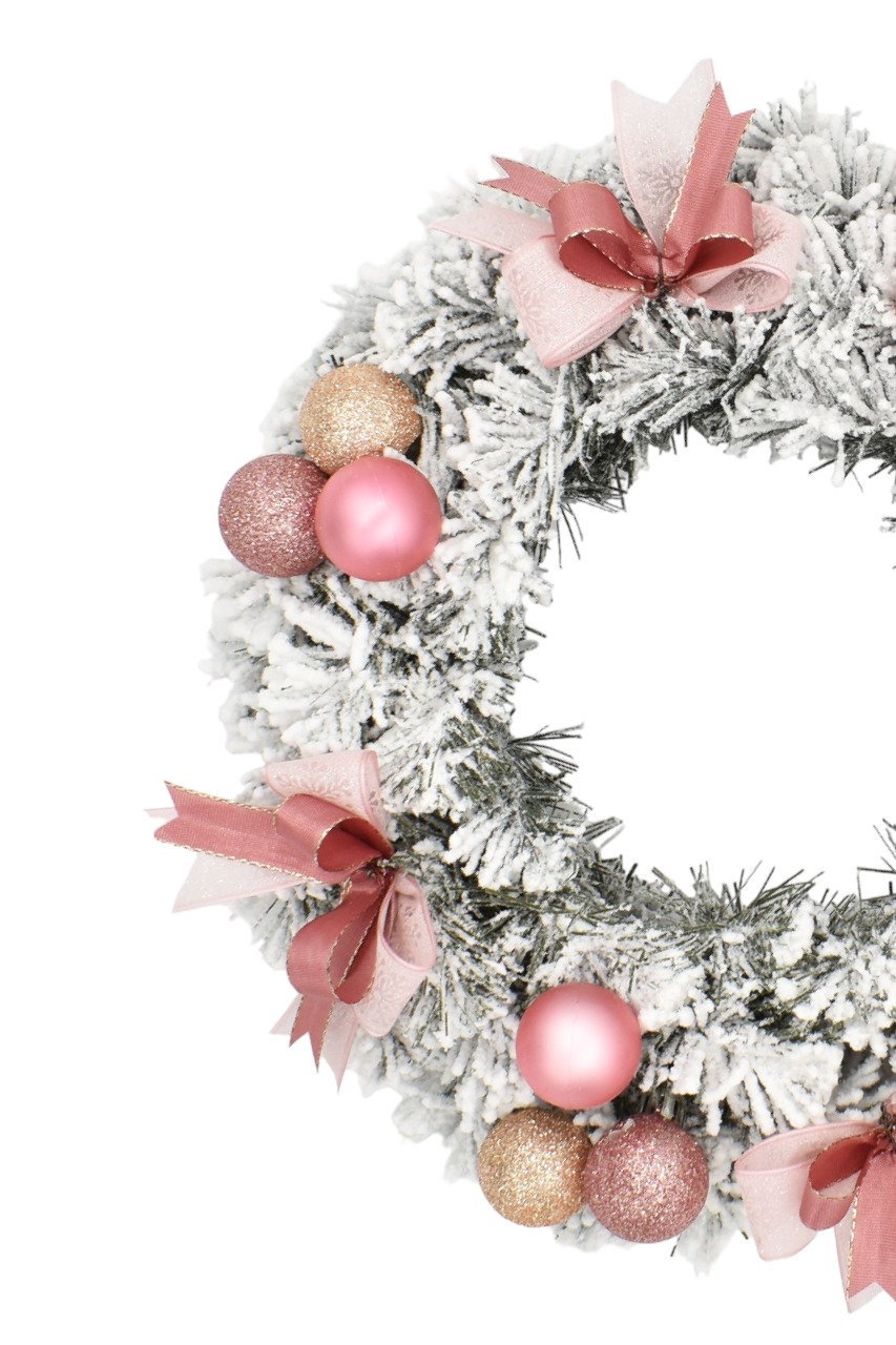 A sűrű műhóval borított dekorációs adventi koszorú tökéletessé teszi a karácsonyi dekorációját. Ez a karácsonyi koszorú sűrű, gazdagon behavazott, minőségileg kidolgozott PVC tűlevelekkel rendelkezik, amelyet világos rózsaszín árnyalatú ízléses díszek, krémszínű gömbök és rózsaszín masnik egészítenek ki.