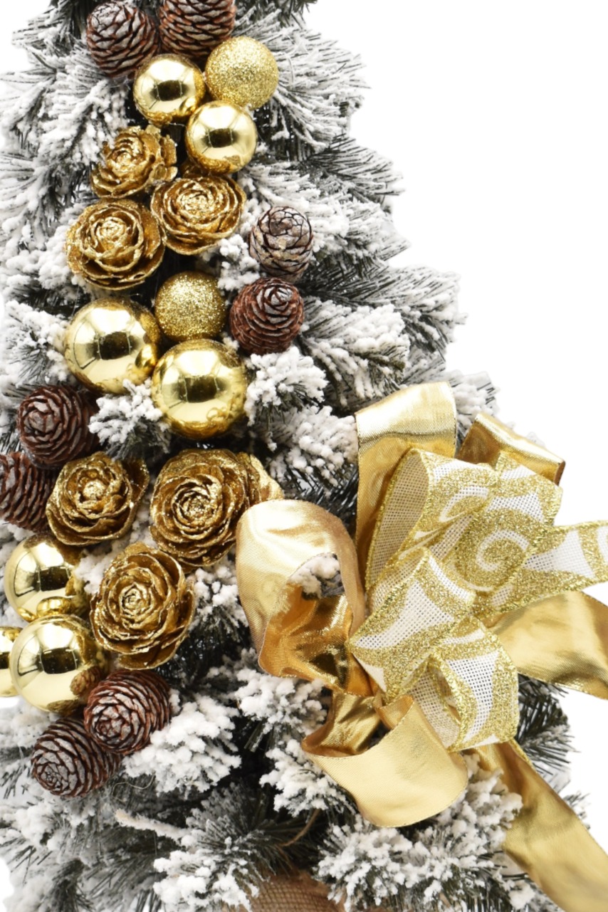 Az arany színű havas kicsi műfenyő nagyszerű dekoráció lesz az otthonában. Ez a feldíszített, kicsi műfenyő téli megjelenésével fogja önt elbűvölni a sűrű mesterséges hórétegnek, az egységes gúlaformának és az ízlésesen összehangolt dekorációnak köszönhetően.