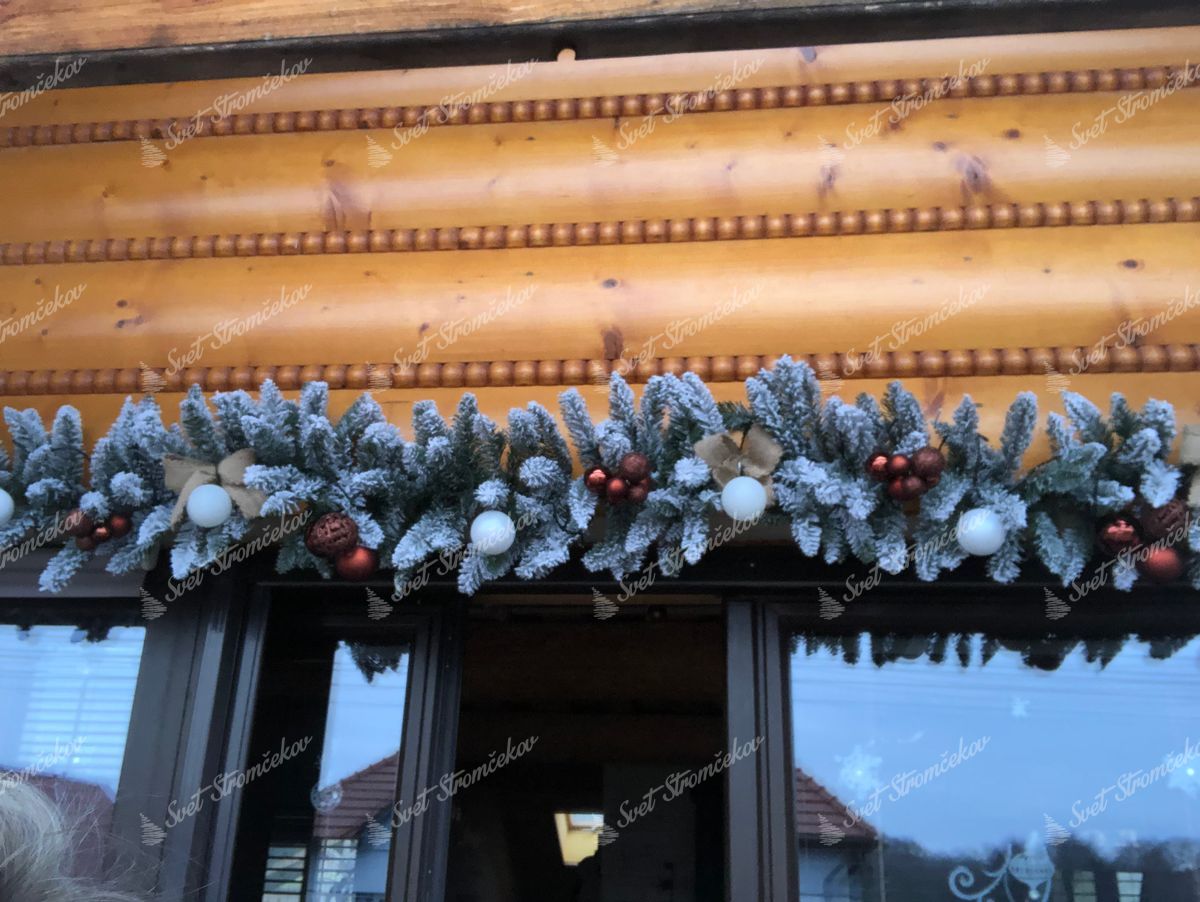 Az ágacskák közepe természetes zöld színű, az ágvégek pedig hóval vannak beborítva, akárcsak a természetben friss havazás után. A legmodernebb technológiának köszönhetően a műhó nem le az ágakról. A girland hossza 3 m és szélessége 30 cm.