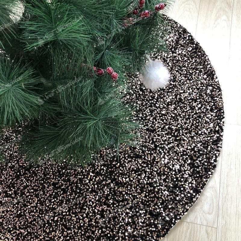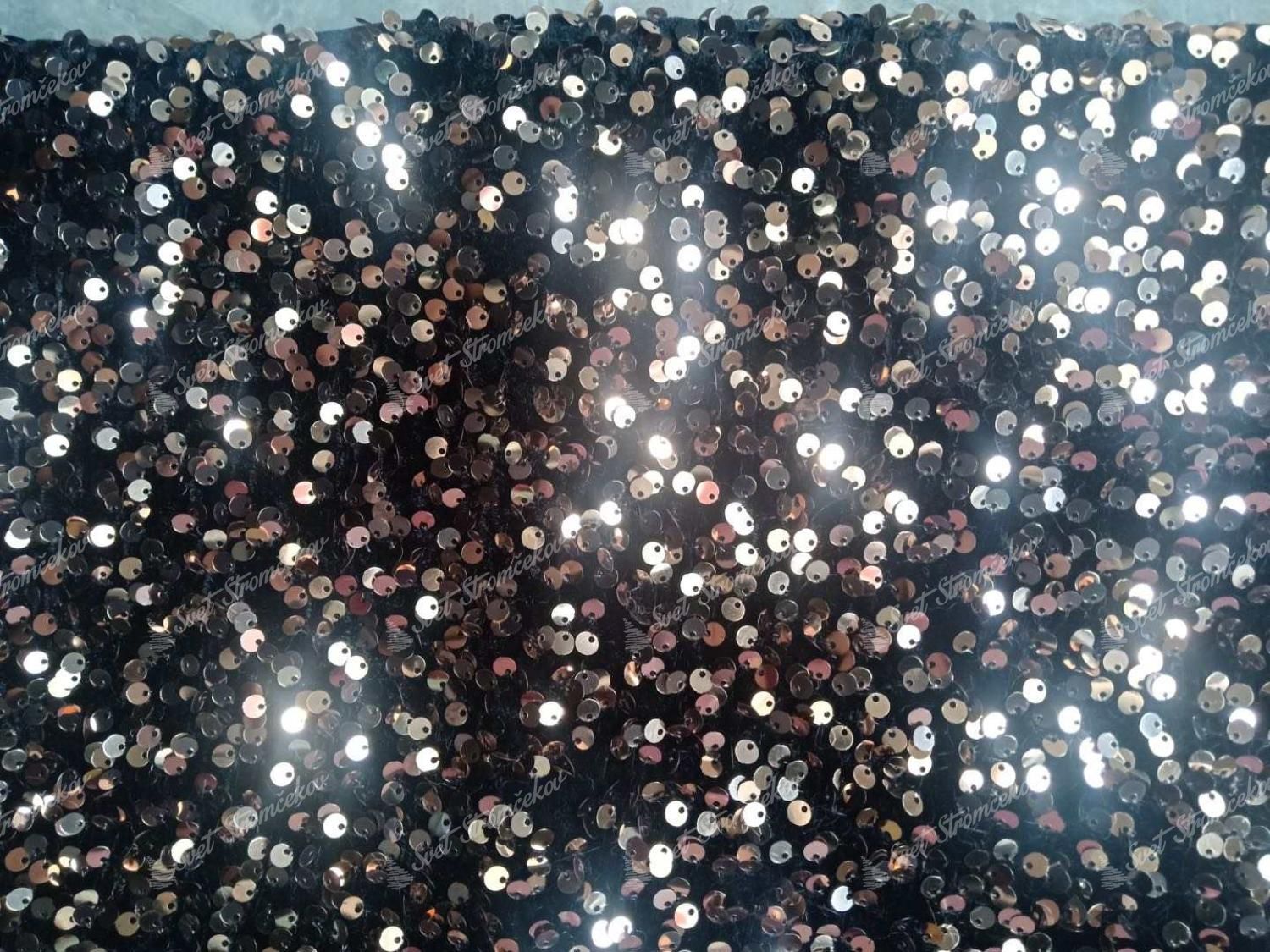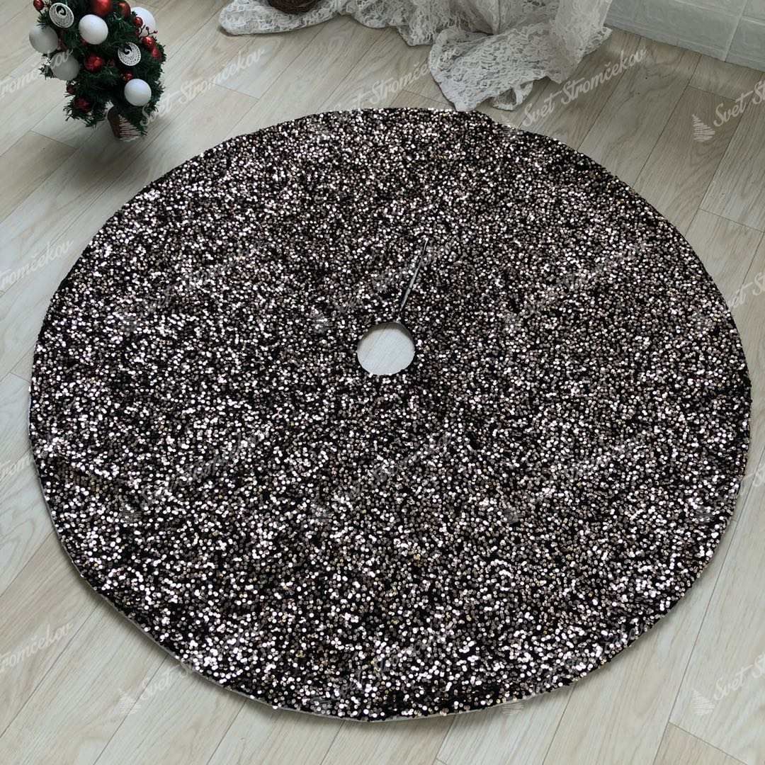 Ezzel a sötét árnyalatú, modern karácsonyfa alá való szőnyeggel az Ön díszítése garantáltan stílusos lesz. A flitterekkel sűrűn kirakott fekete szőnyegnek érdekes rézszínű csillogást ad.